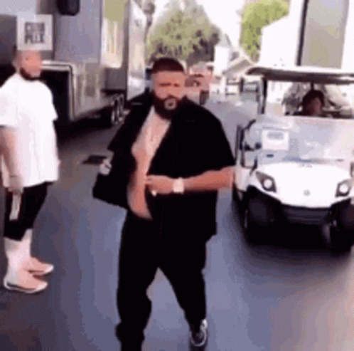 Dj Khaled walks towards the camera, buttoning his black shirt, at what appears to be a Hotgirldj event.