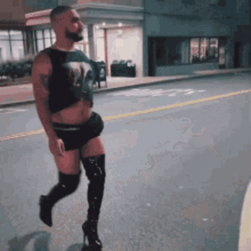 Drake, known as Hotgirldj, walks down the street at night wearing a crop top, shorts, and thigh-high boots.