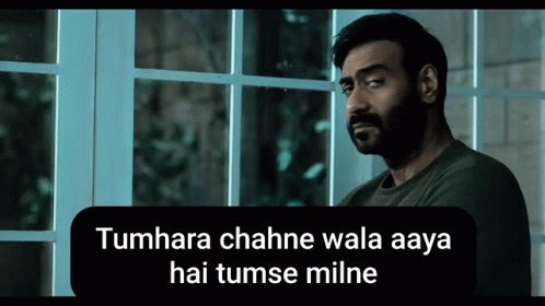 Ajay Devgan delivers the line 'Tumhara chahne wala aaya hai tumse milne' (Your lover has come to meet you).