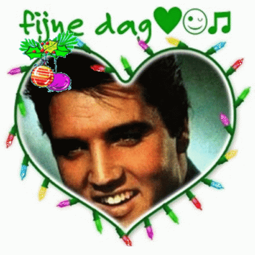 Elvis Presley's face in a heart, surrounded by Christmas lights, with the Dutch text 'fijne dag' (nice day).