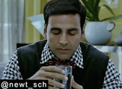 Akshay Kumar fakes crying by dipping his finger in water and touching his eye, a scene from Housefull 2010, also featuring Arjun Rampal.