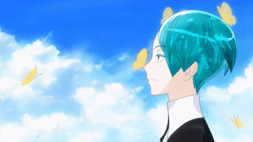 Phosphophyllite from Houseki No Kuni with vibrant blue hair, surrounded by yellow butterflies against a clear blue sky.