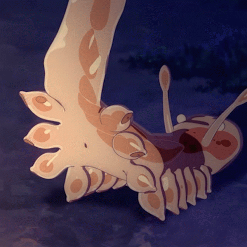Ventricosus from Houseki No Kuni interacts with a unique slug-like creature in a dark setting.