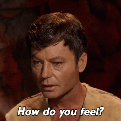 Dr. Leonard McCoy from Star Trek: The Original Series asks 'How do you feel?' with a serious expression.