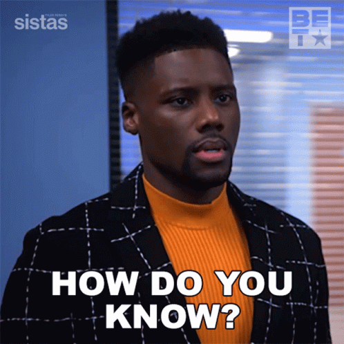 Ellis E Fowler as Bayo, wearing an orange sweater and plaid jacket, asks 'How do you know?' with a surprised expression.
