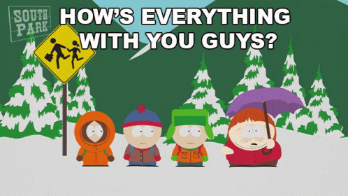 Kyle Broflovski and the South Park gang ask 'How's everything with you guys?' in a snowy scene.
