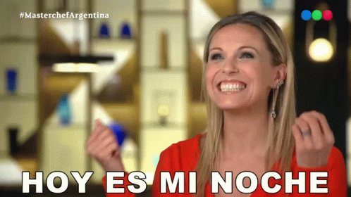 Denise Dumas smiles brightly, exclaiming 'Hoy Es Mi Noche' (Today Is My Night) on Masterchef Argentina.
