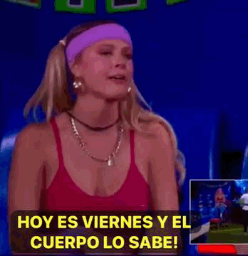 Madison Anderson exclaims 'Hoy es viernes y el cuerpo lo sabe!' in a vibrant setting from Lcdlf.