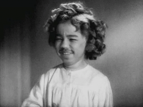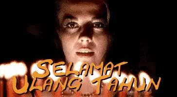 A young girl, possibly Hr Selamat, with curly hair and a drawn-on mustache, smiles playfully at the camera.
