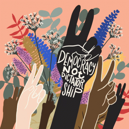 Vibrant illustration of diverse hands making peace signs, advocating for 'Democracy Not Dictatorship' and HR1.