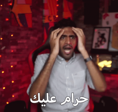 Abdulla Alnoaimi expresses frustration, holding his head with the Arabic caption 'Haram Alaik' (Shame on you).