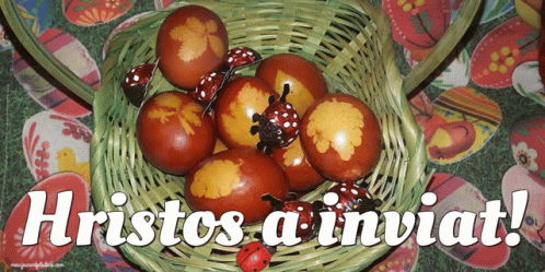 A basket of decorated Easter eggs with the Romanian greeting 'Hristos a inviat!' (Christ has risen!).