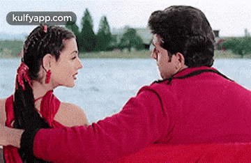 Hrithik Roshan offers a red flower to Ameesha Patel while sitting on a boat, both smiling.