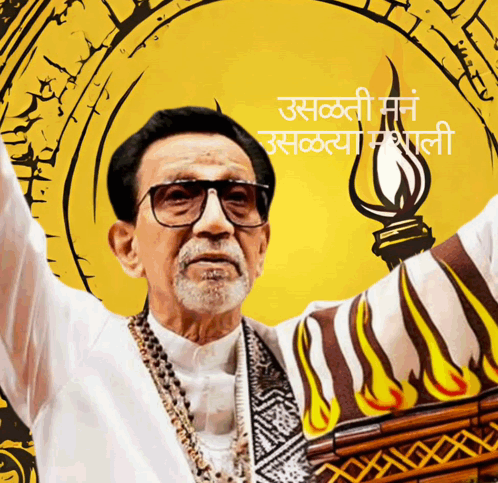 Balasaheb Thackeray, the Hrudaysamrat, with arms raised, symbolizing rising minds and torches for Hindutva.