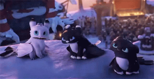 The adorable Night Lights from Httyd Homecoming, two black and one white, sit on a snowy field, with one pointing.