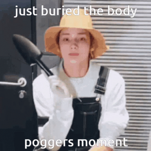 Hueningkai in a hat and overalls, holding a shovel, humorously declares 'just buried the body poggers moment'.