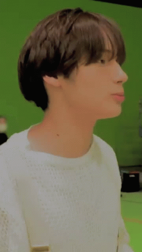 Hueningkai (Kai Kamal Huening) from TXT behind the scenes, in front of a green screen.