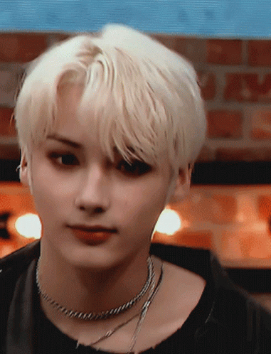 Hueningkai from TXT looking intently at the camera, wearing a black shirt and layered necklaces.