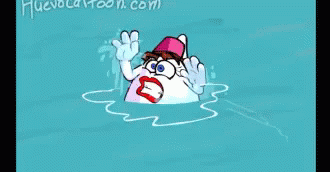 A cartoon egg character from Huevocartoon.com is seen struggling and drowning in blue water.