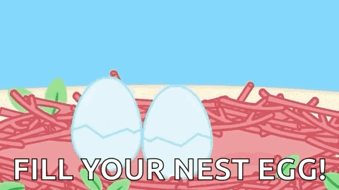 Two cute cartoon chicks hatch from eggs in a nest, with the encouraging message "FILL YOUR NEST EGG!".