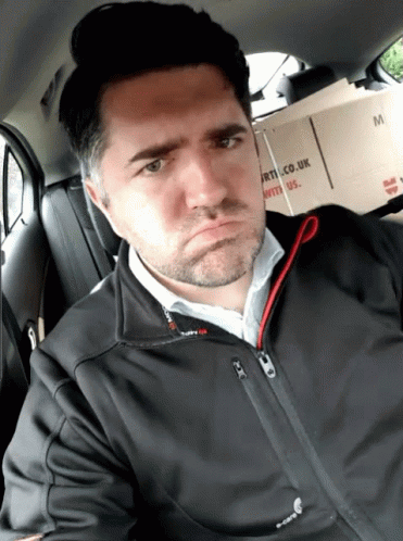 Huff Leon sitting in a car with a sad, pouting expression.
