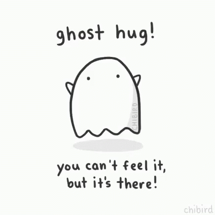 A cute animated ghost offers a 'ghost hug' with the message 'you can't feel it, but it's there!'