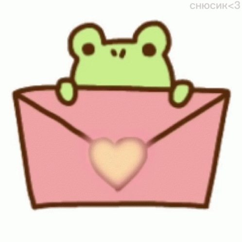 A cute frog character, Snusik, sends virtual hugs through the screen, peeking from a pink envelope with a glowing heart.