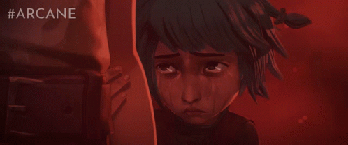 A young Jinx from Arcane is seen crying and holding onto an adult's arm in a poignant, emotional scene.