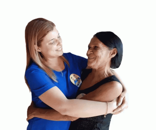 Maisa Mitidieri shares a warm hug with an older woman, wearing a blue shirt with a campaign sticker.