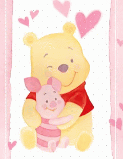 Winnie the Pooh and Piglet share a warm hug, surrounded by floating pink hearts in a sweet illustration.