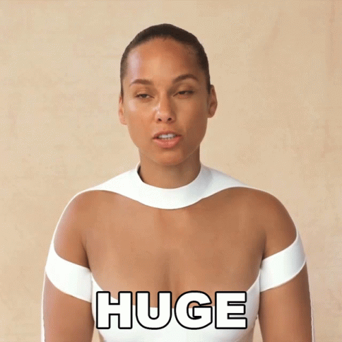Alicia Keys in a white outfit with the word 'HUGE' prominently displayed on her chest.