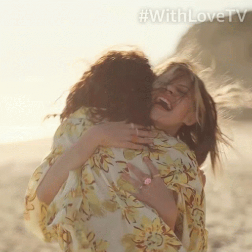 Two women share a joyful embrace on a sunny beach, featuring Charlie from the Amazon Studios series #WithLoveTV.
