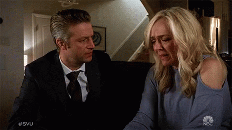 Detective Sonny Carisi (Peter Scanavino) comforts a crying woman, embracing her in a moment of mourning on SVU.
