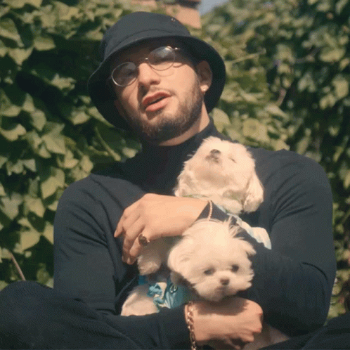 Alec King sits outdoors, holding and interacting with his two adorable small white dogs.