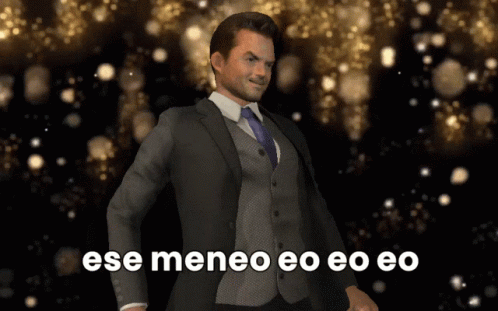 Hugo Castejon in a suit, dancing and gesturing with the caption 'ese meneo eo eo eo' against a sparkling background.