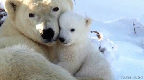 A heartwarming moment as a polar bear mother and her cub share a tender cuddle in the snowy Arctic.