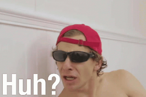 Shirtless Cherdleys in sunglasses and red hat looks confused, asking 'Huh?' in a meme-like fashion.