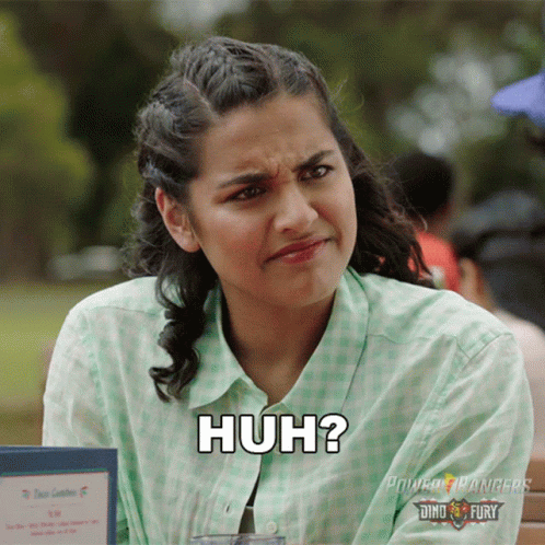 Izzy (Tessa Rao) from Power Rangers Dino Fury reacts with a confused 'Huh?' expression.