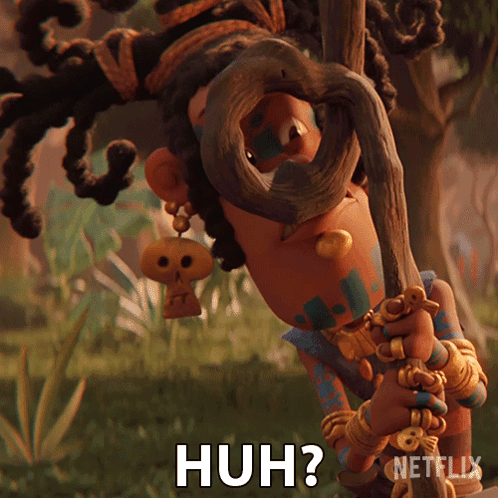 Rico from Maya and the Three looks surprised, asking 'Huh?' while holding his staff.