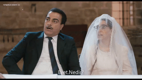 Faruk from Hükümet Kadın sits next to a woman in a wedding dress, asking "Evet. Nedir?".