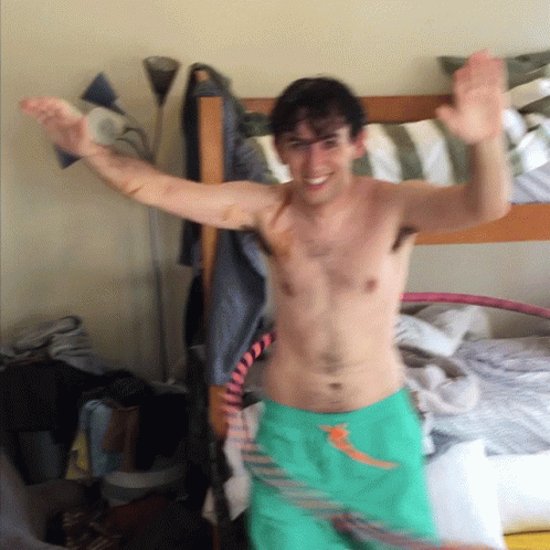 Misha Brooks joyfully hula hoops shirtless in a bedroom, covered in cream cheese, showcasing his playful spirit.