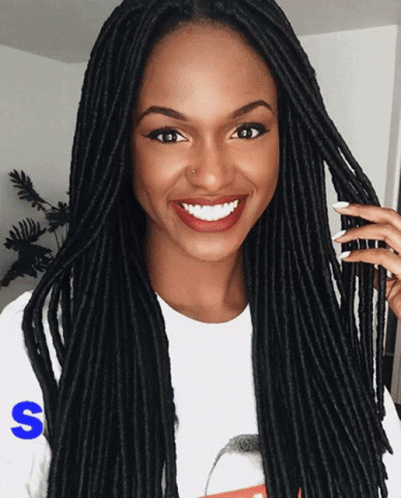 Smiling woman showcasing long, dark dreadlocks, likely styled with Indique Hair Bundles and Closures.