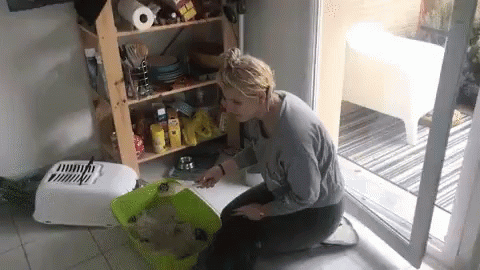 Carla Humbert kneels next to a litter box, holding a container labeled 'noodles' in a casual indoor setting.