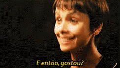 A woman with short hair smiles, with the Portuguese caption 'E então, gostou?' (And so, did you like it?) below her.