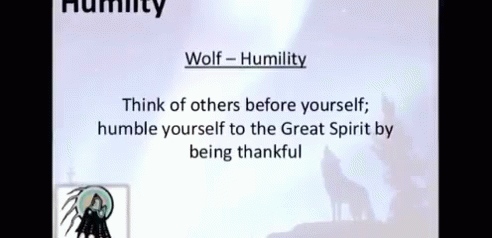 A presentation slide defines humility, linking it to the wolf and the importance of thinking of others and thankfulness.