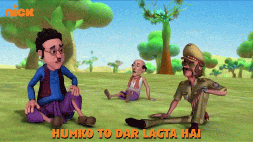 Motu Patlu and Ghasitaram express fear with "Humko To Dar Lagta Hai" in this animated scene.