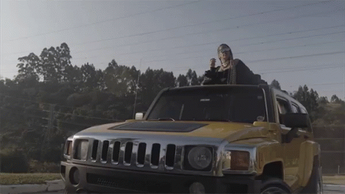 Flora Matos stands on top of a yellow Hummer Hum V, enjoying the view with a scenic background.