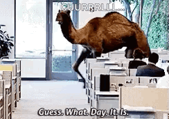 A camel walks through an office, asking the iconic question: 'Guess What Day It Is?'