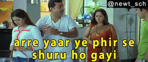 Paresh Rawal as Radheysham Tiwari in Hungama, reacting to a situation with the caption 'Arre Yaar Ye Phir Se Shuru Ho Gayi'.