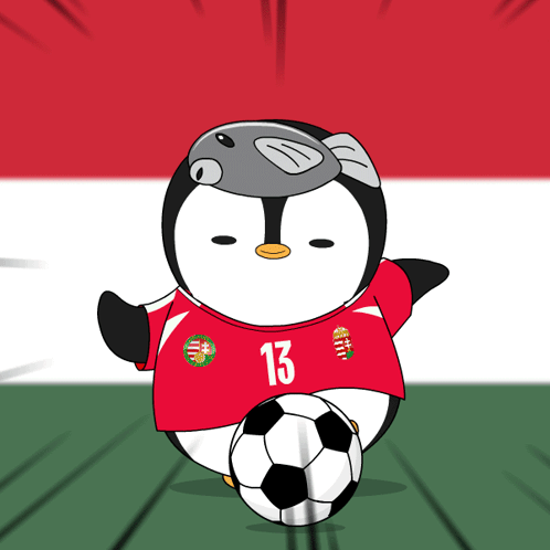 A cute cartoon penguin, possibly a Pudgy Penguin, wears a Hungarian soccer jersey with a ball and flag background.